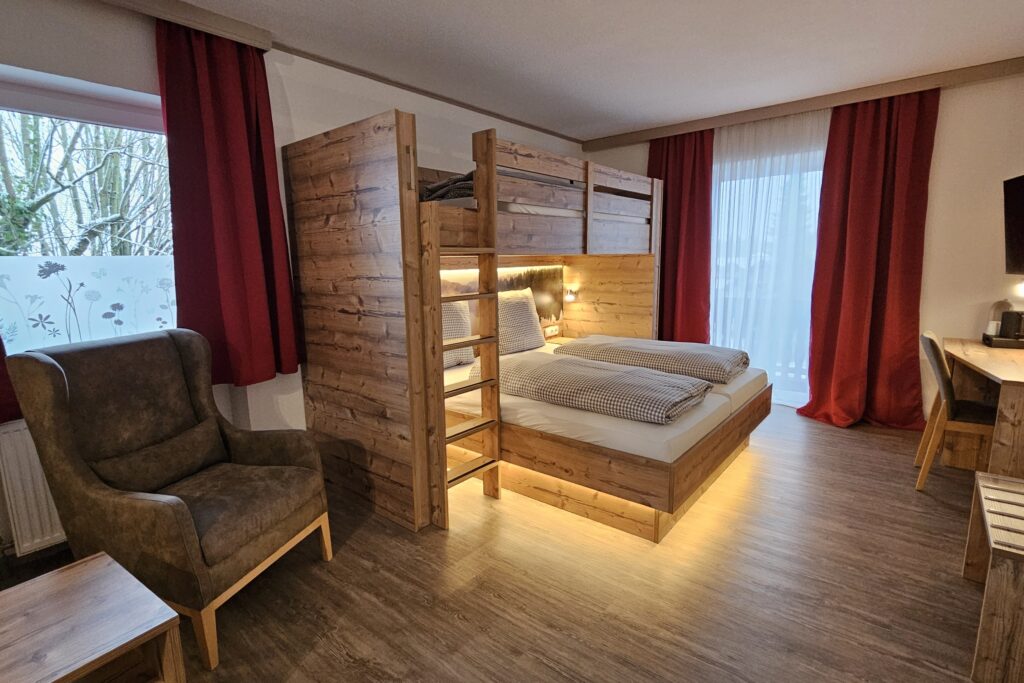 2 der 3 Familienzimmer sind mit einem weiteren Bett über dem Doppelbett ausgestattet, was eine Belegung mit 5 Personen ermöglicht.